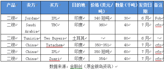 印度:印度二铵到港价格继续下滑,伴随周内中国货源到货价格显示351-353美元/吨。周内有五比订单显示,其中两比通过贸易商,一笔直接来自中国生产厂家,一笔来自Maaden,一笔来自JPMC。Zuari从云天化购进4万吨二铵,船期在7月。