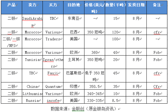 巴基斯坦:Fauji向Quantum标购二铵,7月11日截标。此次标购包含4.5万吨来自澳大利亚货源,9月在Karachi交船。到港价格低于350美元/短吨,但众所周知,这将低于奥压力压货源价格,如此一来,此批货源供应或将出自中国。