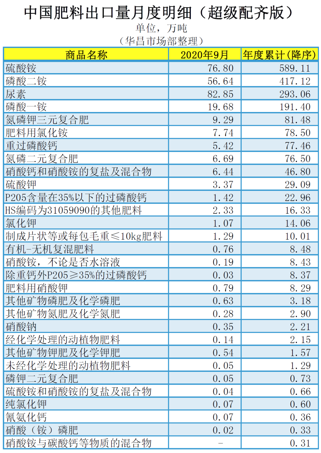 据中国海关统计,2020年1—9月中国共出口各种肥料1993.76万吨(含HS第28章氯化铵、硝酸钾和HS第31章所有肥料),同比减少了3.6%。硫酸铵是累计出口量最多的肥料品种,1-9月累计出口硫酸铵589.11万吨。