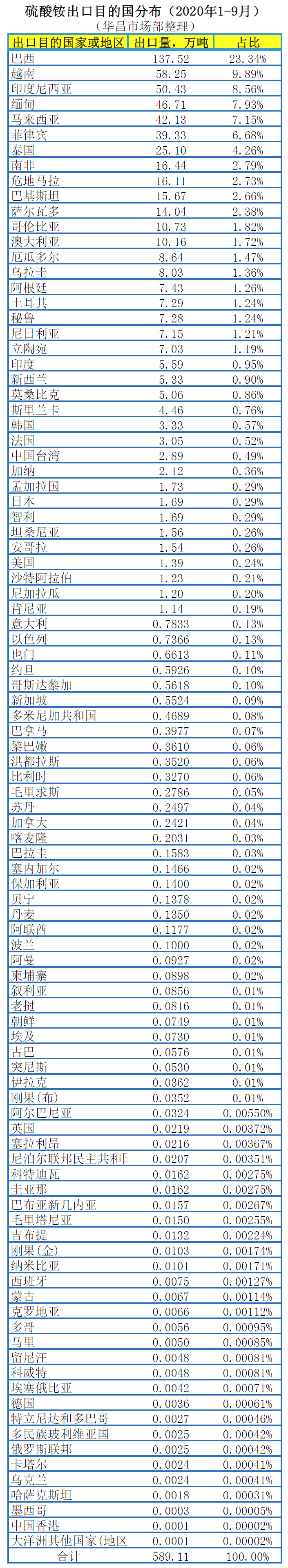 进口量(超级配齐版) 2020年1—9月,中国进口量排在前5名的肥料及原料品种:①除纯氯化钾外其他氯化钾665.60万吨,②硫磺663.91万吨,③氮磷钾三元复合肥107.29万吨,④ 氨82.31万吨,⑤纯氯化钾15.37万吨。 2020年9月当月,中国进口氯化钾(含纯氯化钾)120.52万吨、硫磺86.57万吨、氮磷钾三元复合肥12.50万吨、氨11.47万吨。 硫酸铵出口流向分布 2020年1—9月,中国硫酸铵出口589.11万吨,出口至98个国家和地区。其中出口量第一大的目的国是巴西,累计出口137.52万吨,占出口总量的23.34%。向巴西、越南、印度尼西亚、缅甸、马来西亚、菲律宾、泰国和南非等8个国家出口量占累计出口总量的70.6%。 来源:锋火台