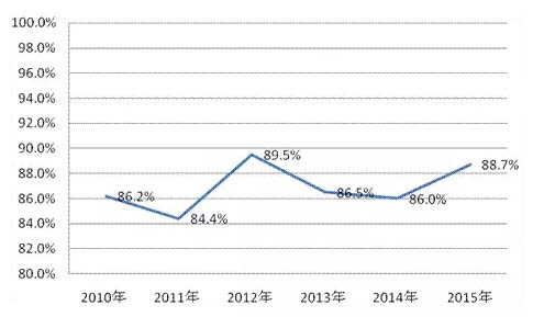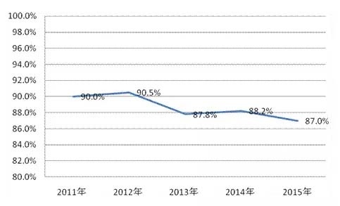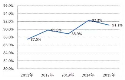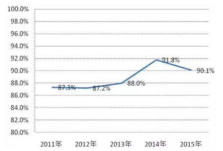 (二)全年共抽查24505家企业生产的25345批次产品,国家产品质量监督抽查合格率为91.1%。从近5年的抽查情况看,产品抽查合格率分别为87.5%、89.8%、88.9%、92.3%和91.1%,整体呈现波动上升态势,虽然2015年比2014年下降了1.2个百分点,但国家监督抽查合格率继去年之后再次达到90%以上。其中,2015年加强了食品相关产品的监督抽查力度,全年共抽查3891家企业生产的4338批次产品,抽查合格率为96.8%。