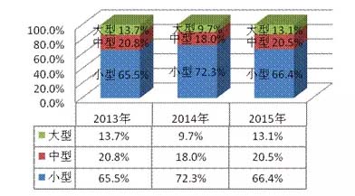 图3:2013年至2015年抽查不同生产规模企业数量对比图