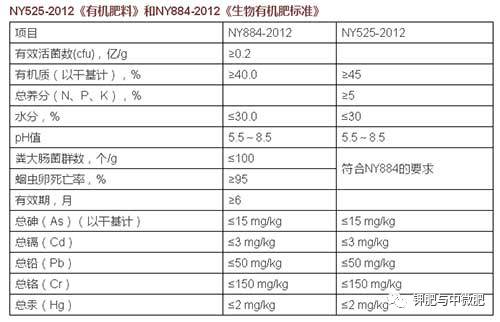 2016年1月1日,新修改后的有机肥料和生物有机肥产品标准NY525-2012《有机肥料》、NY884-2012《生物有机肥》开始实施。新标准和旧标准在重金属限量指标、有机质等质量分数和酸碱度、有机质含量测定方法等方面均发生了较大变化,但对抗生素残留检测标准、含量指标却无要求。