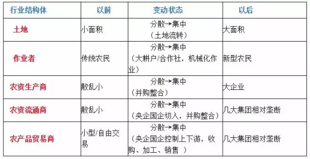 自给自足小量供应(分散)→大耕户/合作社开始出现(集中) →农场主(相对垄断)中国的种植业似乎正在走一条路: