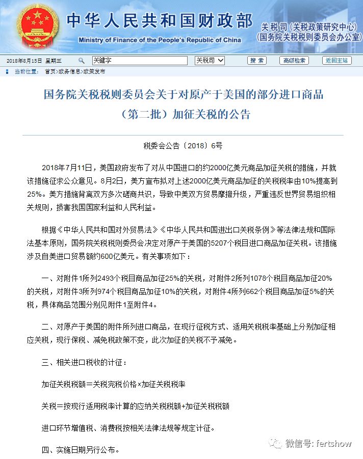国务院关税税则委员会在公告中表示,2018年7月11日美国政府发布了对从中国进口的约2000亿美元商品加征10%关税的措施。8月2日美国贸易代表声明称拟将加征税率由10%提高至25%。针对美方上述措施,中方被迫采取反制措施。根据《中华人民共和国对外贸易法》《中华人民共和国进出口关税条例》等法律法规和国际法基本原则,经国务院批准,国务院关税税则委员会决定对约600亿美元商品加征关税。
