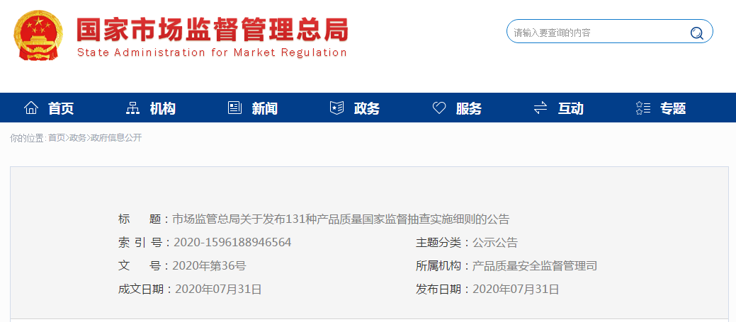 为进一步规范产品质量国家监督抽查工作,营造公开透明、公平公正的监管环境,依照《产品质量监督抽查管理暂行办法》,7月31日市场监管总局编制并发布了《131种产品质量国家监督抽查实施细则》。