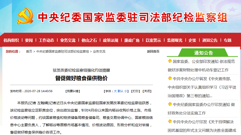 官方消息显示,将坚决打击恶意炒作粮食、囤积居奇等违规违法行为! 记者近日从中央纪委国家监委驻国家发展改革委纪检监察组获悉,该纪检监察组立足职责定位,突出政治监督,针对4月份以来国内稻谷收购价格上涨、市场价格波动等问题,约谈国家粮食和物资储备局粮食储备司、粮食交易协调中心、国家粮油信息中心主要负责人,了解稻谷等原粮市场基本情况、价格波动原因、形势分析和应对举措,督促做好粮食保供稳价各项工作。针对监督约谈了解到的粮食收储面临较大压力、库存消化困难以及疫情期间粮食保供稳价面临各类风险挑战等情况,该纪检监察组向相关负责人提出,要切实提高政治意识,深刻认识做好粮食保供稳价是践行“两个维护”的具体体现;在全球新冠肺炎疫情流行的大背景下,要加强对粮食生产、流通、交易等各方面情况的分析研判,坚持底线思维、风险意识,防止出现蝴蝶效应和连锁反应;要进一步做好粮油价格监测、粮食宏观调控等各项工作,一旦发现苗头性倾向性问题,要精准果断作出应对处置,坚决打击恶意炒作、囤积居奇等违规违法行为,指导地方和有关企业做好应对。据了解,当前我国粮食市场供应充足,总体保持平稳态势,各大夏粮主产区正加大收购力度,收购进度处于正常水平。截至7月10日,主产区各类粮食企业累计收购小麦3207.3万吨,累计收购最低收购价小麦415.2万吨。各级储备粮轮换收购积极,部分库点收购价高于最低收购价。国家粮食和物资储备局表示,将严格落实最低收购价政策,抓好市场化收购,充分发挥12325全国粮食流通监管热线作用,严肃查处各类违法违规行为,切实维护粮食收购市场秩序。 “ 我们将持续跟进监督,督促国家粮食和物资储备局认真落实监管责任,强化法治思维,持续深化体制机制改革,加强粮食市场监测预警,破解难题,切实增强保障国家粮食安全能力。”驻国家发展改革委纪检监察组相关负责人说。