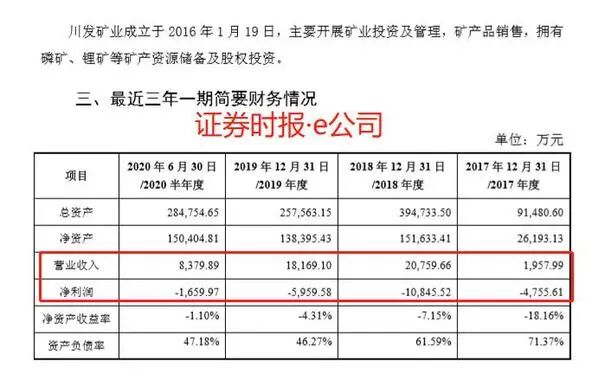 据了解,近年来,川发矿业经营业绩并不理想,净利润一直处于亏损状态。2017年至2020年上半年,川发矿业分别完成营业收入0.19亿元、2.08亿元、1.82亿元和0.84亿元,分别实现净利润-0.48亿元、-1.08亿元、-0.6亿元和-0.17亿元。