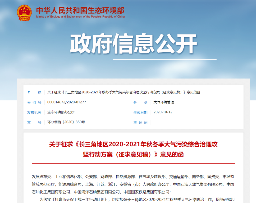 长三角地区2020-2021年秋冬季大气污染综合治理攻坚行动方案