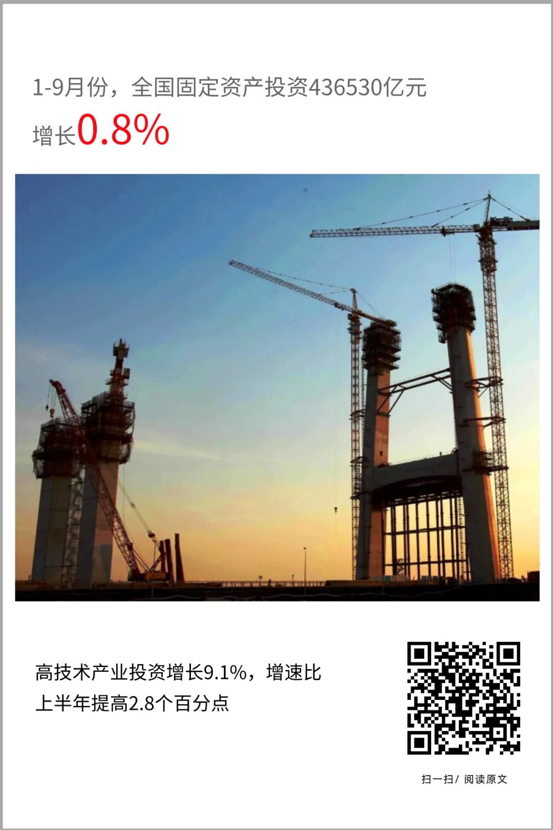 前三季度,全国固定资产投资(不含农户)436530亿元,同比增长0.8%,增速年内首次由负转正,上半年为下降3.1%。