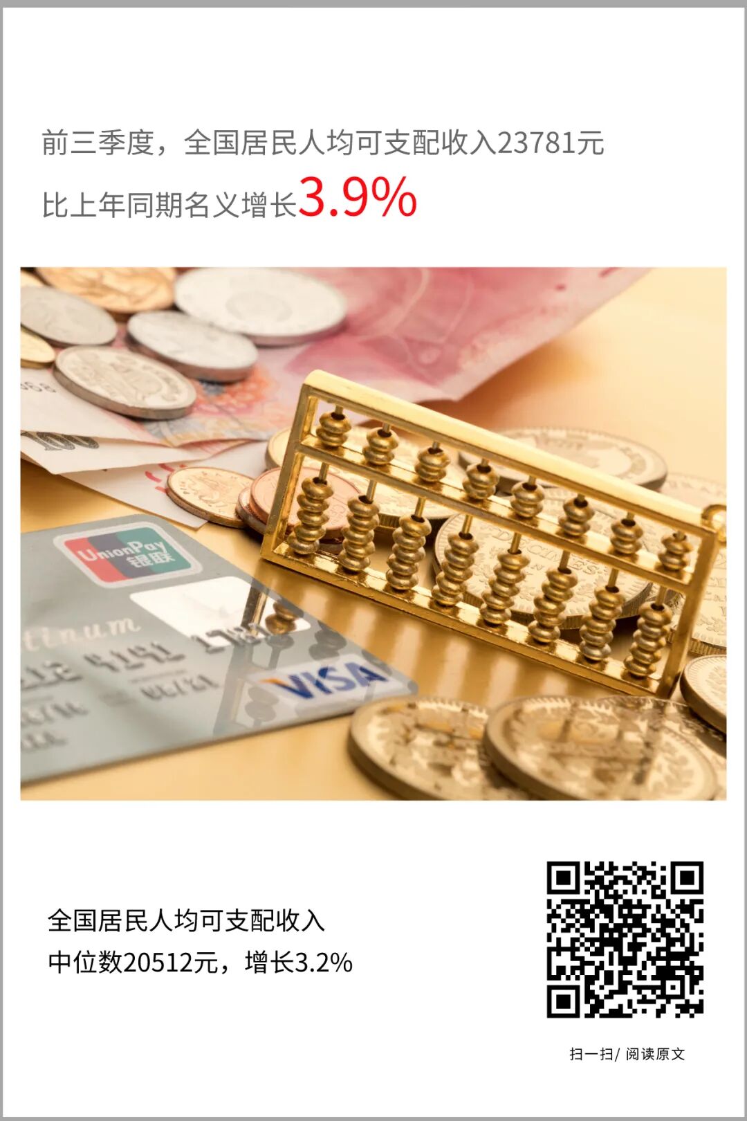 前三季度,全国居民人均可支配收入23781元,同比名义增长3.9%,扣除价格因素实际增长0.6%,年内首次转正,上半年为下降1.3%。按常住地分,城镇居民人均可支配收入32821元,名义增长2.8%,实际下降0.3%;农村居民人均可支配收入12297元,名义增长5.8%,实际增长1.6%。城乡居民人均可支配收入比值为2.67,比上年同期缩小0.08。全国居民人均可支配收入中位数20512元,同比名义增长3.2%。
