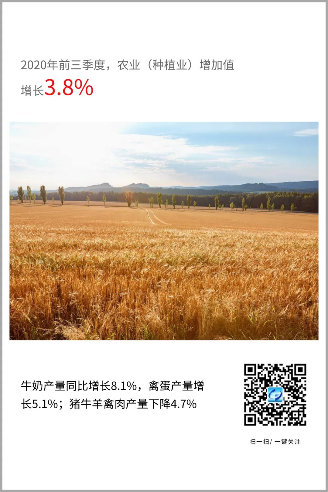 前三季度,农业(种植业)增加值同比增长3.8%,增速与上半年持平;其中,三季度增长3.9%。