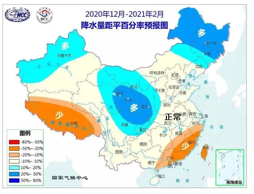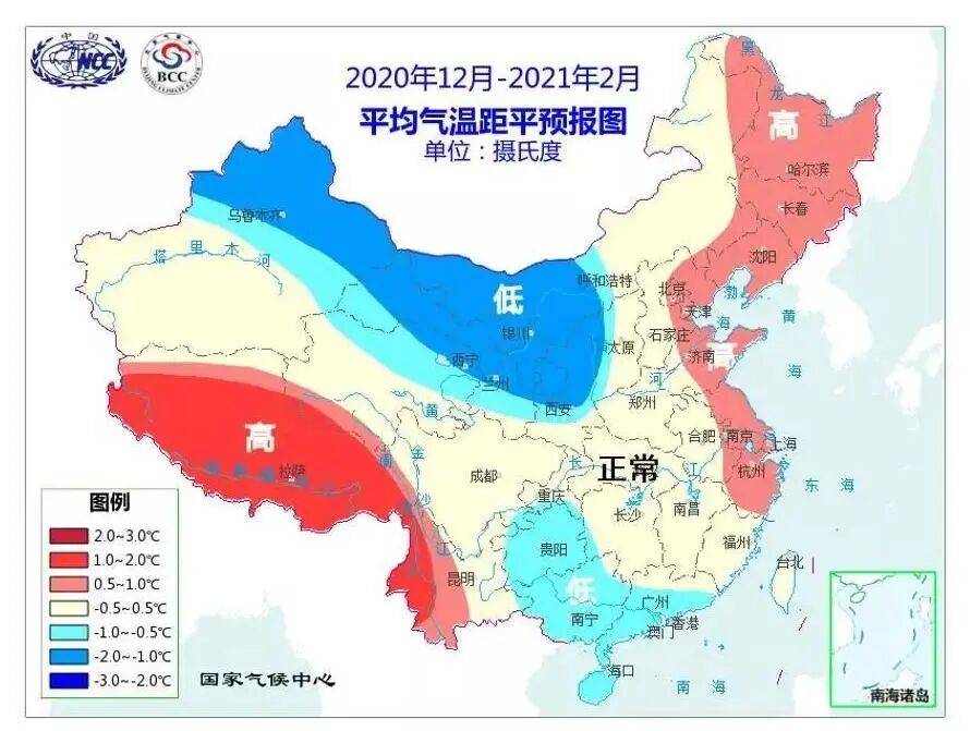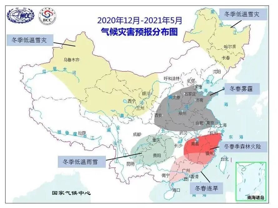 预计今年冬季(2020年12月至2021年2月)影响我国的冷空气活动频繁,势力偏强,主要以西北路径影响我国,全国大部气温接近常年同期到偏低,需特别重视隆冬(2021年1月)可能出现大范围强低温雨雪过程。 前冬(2020年12月),除内蒙古西部、西北地区东北部及华南部分地区气温偏低外,全国大部气温接近常年或略偏高;隆冬(2021年1月)冷空气活动将明显转强,我国中东部大部地区气温可能较常年同期偏低,其中西北地区大部、华南大部、西南地区东部等地气温将明显偏低,我国北方地区可能出现大范围低温雨雪天气,南方发生大范围、持续性低温雨雪冰冻灾害的可能性较小,但西南东部和江南部分地区可能发生阶段性低温雨雪冰冻天气过程; 后冬(2021年2月),全国大部气温接近常年或偏高。冬季,汾渭平原和京津冀及周边地区大气污染扩散气象条件总体接近近五年平均。 明年春季(2021年3月至2021年5月),全国大部地区气温较常年同期偏高、降水偏少,华南中东部、江南南部发生冬春连旱的可能性较大,华南东部和江南东南部林区冬春森林火险等级较高。今年冬季冷空气活动频繁,气温波动大,需防范给新冠肺炎疫情防控工作带来的不利影响。 一、今年冬季气温总体呈东暖西冷分布,季节内冷暖波动大,气温阶段性变化明显,降水北多南少 冬季气温总体呈东暖西冷分布,季节内冷暖波动大,阶段性变化特征明显。冬季,新疆北部和东部、内蒙古西部、甘肃大部、青海北部、宁夏、陕西大部、山西西部、贵州、广西大部、广东大部、海南等地气温较常年同期偏低,其中新疆北部、甘肃大部、内蒙古西部、宁夏、陕西中部和北部等地偏低1-2摄氏度。全国其余大部地区气温接近常年同期到偏高,其中西藏大部、云南西部偏高1-2摄氏度(见图1) 图1 2020年12月至2021年2月平均气温距平预报图 冬季降水总体呈北多南少的分布。内蒙古西部和东部、东北地区中部和北部、西北地区中东部、新疆西北部、西南地区北部等地降水较常年同期偏多,其中内蒙古东北部、黑龙江大部、吉林北部、陕西西南部、甘肃中东部、宁夏大部、青海东部、四川北部等地偏多2-5成;全国其余大部地区降水接近常年同期到偏少,其中西藏大部、浙江南部局部、福建、广东东部、江西东南部等地降水偏少2-5成(见图2)。 图2 2020年12月至2021年2月降水量距平百分率预报图 二、明年春季全国大部地区气温偏高、降水偏少 春季气温总体偏高,除黑龙江大部、内蒙古东北部局部、广西大部、广东西南部、海南、云南中部和东部、贵州南部等地气温较常年同期偏低外,全国其余大部地区气温接近常年同期到偏高,其中新疆、内蒙古西部、甘肃西部、青海西北部、西藏西北部等地偏高1-2摄氏度。 春季降水方面,黑龙江、吉林、辽宁北部、内蒙古东部、四川西部和南部、贵州西部、云南、西藏中东部、广西西部等地降水偏多,其中云南西北部、四川南部部分地区、西藏东南部等地偏多2-5成;全国其余大部地区降水接近常年同期到偏少,其中广东大部、福建、浙江南部、江西中部和南部、湖南东南部、新疆北部和东部、内蒙古西部局部、甘肃西部等地偏少2-5成。 三、今冬明春可能发生的气象灾害及防范应对措施建议 1. 冬季冷空气活动频繁,气温波动大,需防范给新冠肺炎疫情防控工作带来的不利影响。冬季是呼吸道疾病的高发期,也是呼吸类疾病死亡率的高峰。低温环境利于病毒存活和传播。进入冬季后,由于气温低,人体抵抗力下降,易感性增加,今年冬季冷空气活动将较为频繁,气温波动大,可能给新冠肺炎疫情防控工作带来不利影响,防范措施不能放松。 2.北方地区应做好雪灾和低温的应对准备。今冬新疆北部、内蒙古西部和东北部、西北地区中东部、东北地区中北部等地可能出现阶段性强降温、强降雪过程,要做好雪灾和低温防御工作。 3.防范南方地区阶段性低温雨雪冰冻天气的不利影响。今冬西南地区东部和江南西部可能出现阶段性低温和雨雪冰冻天气过程,需要做好其对交通、电力和农业春耕生产的不利影响。