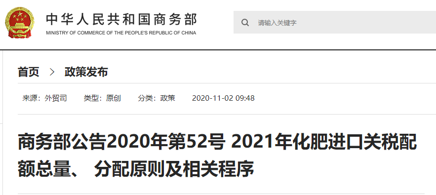 根据《中华人民共和国货物进出口管理条例》、《化肥进口关税配额管理暂行办法》,商务部制定了《2021年化肥进口关税配额总量、分配原则及相关程序》,现予以公布,请遵照执行。 商务部 2020年10月30日 2021年化肥进口关税配额总量、 分配原则及相关程序 第一条 化肥进口关税配额总量 2021年化肥进口关税配额总量为1365万吨。其中,尿素330万吨;磷酸二铵690万吨;复合肥345万吨。 第二条 国营贸易及非国营贸易关税配额 2021年化肥国营贸易关税配额数量分别为:尿素297万吨,磷酸二铵352万吨,复合肥176万吨。国营贸易企业中国中化集团公司、中国农业生产资料集团公司在国营贸易总量内申请关税配额。 2021年化肥非国营贸易配额数量分别为:尿素33万吨,磷酸二铵338万吨,复合肥169万吨。非国营贸易企业中国化工建设总公司、华垦国际贸易有限公司在非国营贸易总量内申请关税配额。 其他企业根据实际进口需要选择申请国营贸易关税配额或非国营贸 易关税配额,由国营贸易企业或非国营贸易企业代理进口。 第三条 分配原则 2021年化肥进口关税配额实行先来先领的分配方式。凡在工商行政管理部门登记注册的企业,在其经营范围内均可申请化肥进口关税配额。 第四条 申领方式 企业申领化肥进口关税配额实行先来先领,直至化肥进口关税配额总量申领完毕。企业申领化肥进口关税配额时,其可申领的起始关税配额数量根据以往实际关税配额使用情况设定,在起始关税配额数量内企业可分次申领《化肥进口关税配额证明》。企业报关进口后或将未使用的化肥进口关税配额退回后,可在不超过起始关税配额数量的范围内再次申领化肥进口关税配额。 第五条 起始关税配额数量 2021年起始数量以2020年起始数量为基础,并按以下情况进行调整: (一)2020年核销率在80%以上的企业,上调40%; (二)2020年核销率在50%—79%的企业,上调20%; (三)2020年核销率在25%-49%的,维持不变; (四)2020年核销率在25%以下的,扣减50%; (五)2020年之前有业绩,但2020年没有申领化肥进口关税配额证明的企业,起始量维持不变; (六)新申请企业:起始关税配额2000吨。 (七) 2021年关税配额起始申领量最高不超过50万吨,最低不低于2000吨。 第六条 申领材料 企业向受商务部委托的化肥进口关税配额发证机构(以下称关税配额发证机构)申领化肥进口关税配额,申领时需提供以下材料原件或副本及复印件: (一)《化肥进口关税配额申请表》及申明报送材料真实性的承诺函; (二)具有法律效力的进口合同或委托代理的进口合同; (三)银行信用证或其他付汇凭证; (四)提单或其他能证明货物所有权的有效凭证; (五)关税配额管理机构要求出具的其他材料; (六)2021年度内首次申领的新申请企业除提供上述规定材料外,需同时提供营业执照及企业代码,中外合资经营企业、中外合作经营企业和外资企业需提供批准证书或依据《外商投资企业设立及变更备案管理暂行办法》取得的备案回执。 第七条 《化肥进口关税配额证明》的申请、受理及发放 各关税配额发证机构负责受理所在地企业化肥进口关税配额申请,并在5个工作日内为申请材料齐全、符合条件的企业签发《化肥进口关税配额证明》,同时留存企业申请材料的复印件。 各关税配额发证机构可以邮寄、快递、现场提交的方式向商务部行政事务服务大厅提交符合条件的首次申领化肥进口关税配额企业的申请和营业执照、企业代码、中外合资经营企业、中外合作经营企业和外资企业批准证书(或依据《外商投资企业设立及变更备案管理暂行办法》取得的备案回执)等申请材料复印件,并抄送商务部配额许可证事务局。商务部对外贸易司审核备案后,即可到关税配额发证机构申领化肥进口关税配额证明。 第八条 《化肥进口关税配额证明》的有效期、更改和遗失 《化肥进口关税配额证明》有效期3个月,最迟不得超过2021年12月31日。延期或者变更的,需重新办理,旧证撤销同时换发新证,并在备注栏中注明原证号。《化肥进口关税配额证明》如遗失,企业应在10个工作日内向原关税配额发证机构和证面所列报关口岸办理挂失手续。核实无误后,原关税配额发证机构签发新证并在备注栏中注明原证号。 第九条 已使用《化肥进口关税配额证明》的核销 企业在报关进口的10个工作日内,凭加盖企业公章的书面核销函到关税配额发证机构预核销已使用《化肥进口关税配额证明》,核销函需列明化肥进口关税配额证号、报关单号、报关数量、报关日期、报关口岸等。预核销的已使用关税配额不计入企业可申领的起始关税配额数量,企业可按预核销数量再次申领《化肥进口关税配额证明》。企业办理全部付汇、清关手续后,需凭报关单及付汇凭证到关税配额发证机构正式核销已使用《化肥进口关税配额证明》。正式核销手续应在清关后3个月内完成。 对于确需延期付汇的企业,需由企业出函说明情况,并承诺在付汇后,持银行出具的境外汇款申请书(企业联)到关税配额发证机构正式核销。 第十条 未使用《化肥进口关税配额证明》的退还 企业需将未使用或未全部使用的《化肥进口关税配额证明》在有效期满后15个工作日内退还关税配额发证机构。企业退回的未使用化肥进口关税配额数量归入全国未使用化肥进口关税配额总量。 第十一条 《化肥进口关税配额证明》核销的