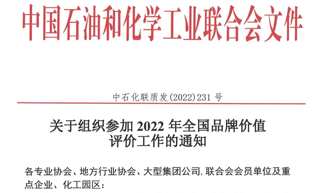 根据《关于开展2022年品牌价值评价工作的通知》(国品会〔2022〕50号)的有关安排,为践行习近平总书记“三个转变”的重要论述,贯彻落实国务院“推动形成具有中国特色的品牌价值评价机制”和“推动建立全球统一的品牌评价体系”的要求,全面贯彻党的二十大提出的“高质量发展是全面建设社会主义现代化国家的首要任务”的重要精神,培育更多高质量中国品牌,提升我国品牌影响力和竞争力,推动我国经济实现质的有效提升和量的合理增长,中国品牌建设促进会将在全国范围内开展2022年品牌价值评价工作,并由我会组织推荐优秀石油和化工企业、化工园区参加,现将有关事项通知如下: