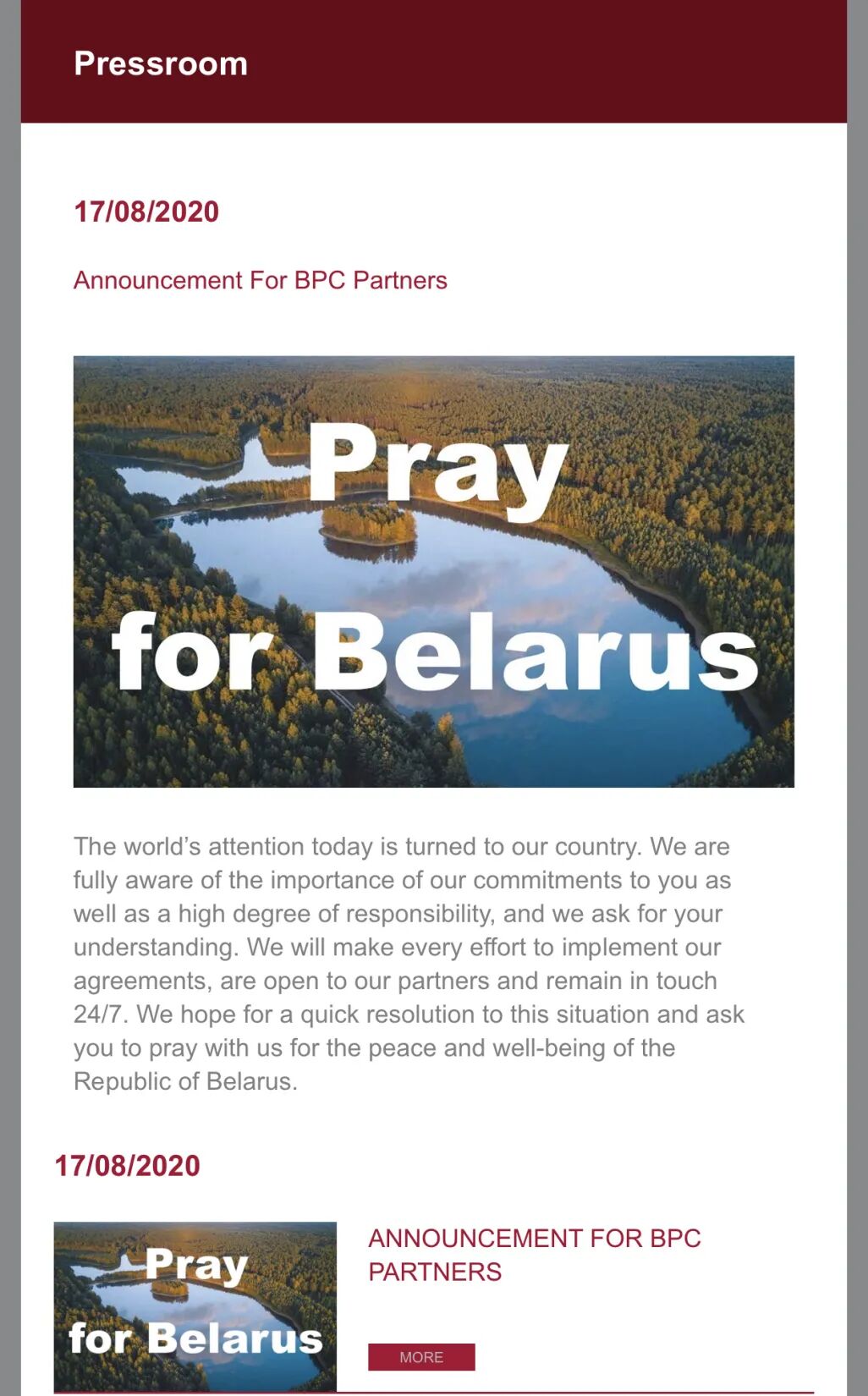 面对当前形势,8月17日,BPC网站发布了《告合作伙伴书》:今天全世界都在关注白俄罗斯,白俄罗斯钾肥公司深知对您承诺的重要性和对您应负的责任,希望能获得您对我们的理解。白俄罗斯钾肥公司将尽其所能去履行所有签订的合同,我们对所有的合作伙伴是开放的,您可以全天候与我们联系。白俄罗斯钾肥公司希望能尽快结束目前的状况,并请您与我们一起祈祷白俄罗斯共和国和平与繁荣。